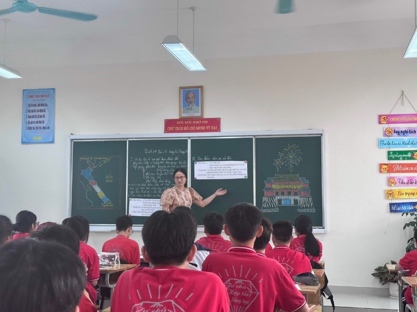 Chuyên đề thực hiện qua nội dung bài 23: Vùng Bắc Trung Bộ. Giáo viên đã sử dụng hình ảnh, khẩu hiệu hằng ngày kết hợp video, lược đồ, sơ đồ Địa lí,… tạo hứng thú, sự chú ý, tập trung cho học sinh. Trong tiết dạy học, giáo viên hướng dẫn học sinh nhiều hoạt động học tập: khởi động là trò chơi nhỏ đuổi hình bắt chữ, khai thác kiến thức mới từ hoạt động cá nhân đến nhóm và cặp đôi hoàn thành phiếu học tập, ….