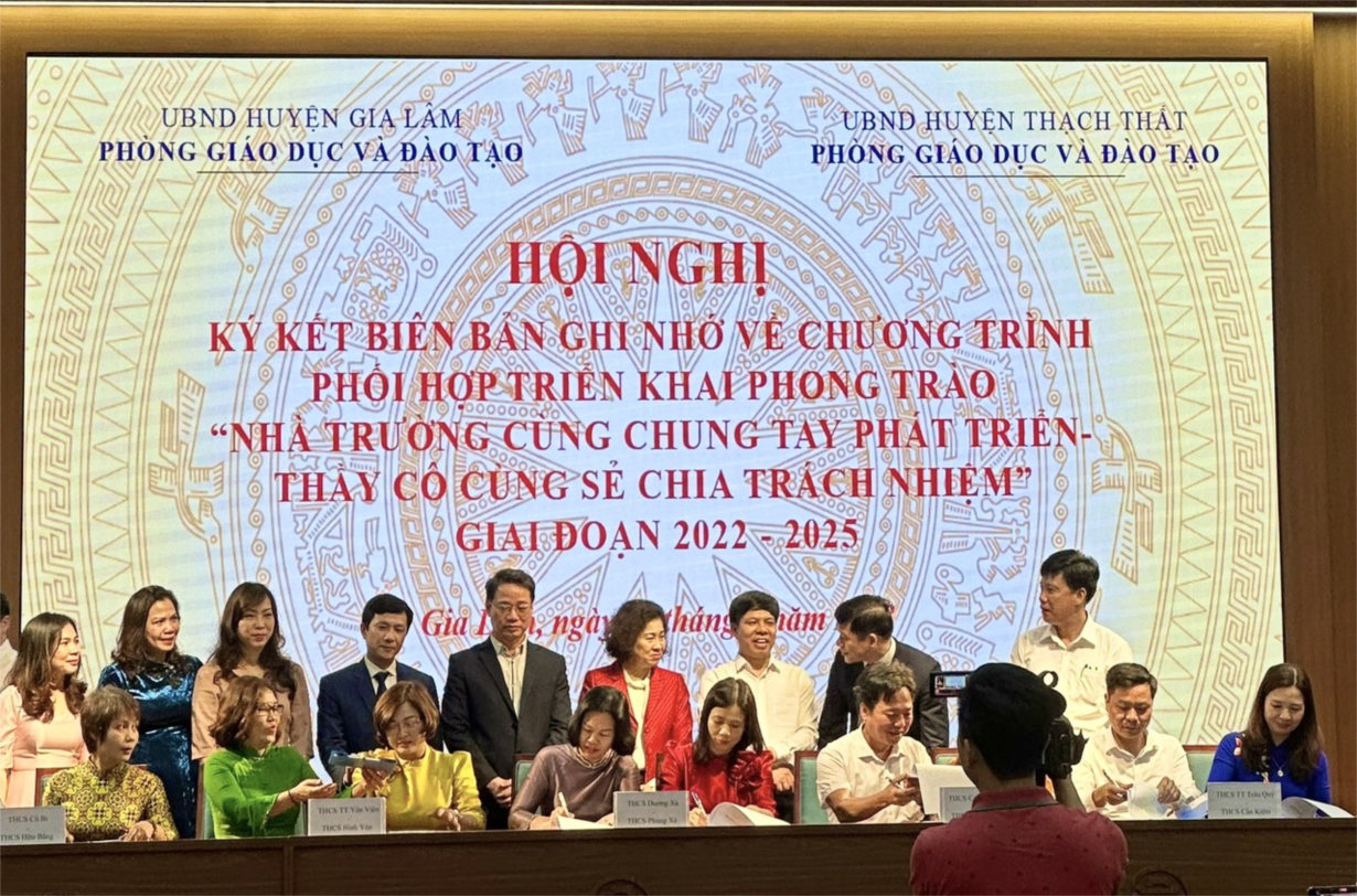 Các nhà trường thuộc 2 huyện đã kí giao kết về chương trình kết nghĩa, triển khai phong trào “Nhà trường cùng chung tay phát triển, thầy cô cùng chia sẻ trách nhiệm” giai đoạn 2022 - 2025 ở các cấp học. Trường THCS thị trấn Trâu Quỳ - huyện Gia Lâm cũng vui mừng kí giao kết hợp tác với trường THCS Cần Kiệm - huyện Thạch Thất.