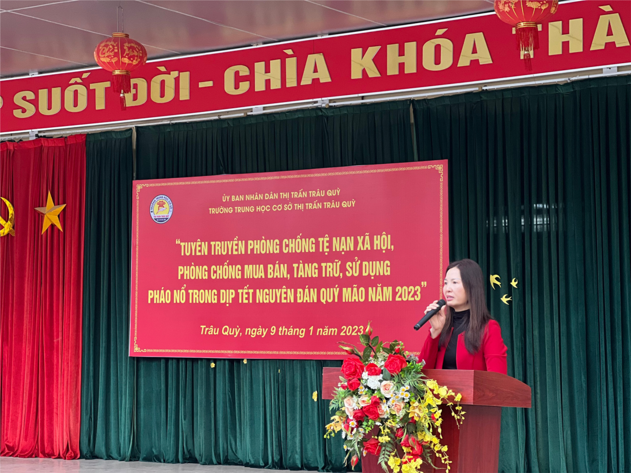 Sáng ngày 09/1/2023, Trường THCS TT Trâu Quỳ phối hợp với Công an huyện Gia Lâm tổ chức tuyên truyền, phổ biến giáo dục pháp luật “Phòng chống tệ nạn xã hội, phòng chống mua bán, tàng trữ, sử dụng pháo nổ trong dịp tết nguyên đán Quý Mão năm 2023”.