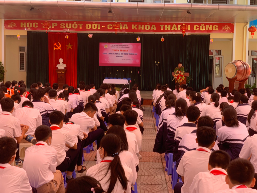 Tại buổi tuyên truyền, các em học sinh đã được đại diện Công an TT Trâu Quỳ thông tin về tình trạng bạo lực học đường đã và đang diễn ra trên khắp thế giới ở tất cả các bậc học khác nhau, trong đó có ở Việt Nam. Bạo lực học đường là một hiện tượng xã hội xảy ra ở nhiều nơi, nhiều cấp học, nhiều mức độ. Có những trường hợp chỉ đơn giản là đánh nhau, gây gổ, nhưng cũng có rất nhiều trường hợp xảy ra ở mức độ nghiêm trọng, tụ tập để “trả thù”, “dằn mặt” nhau bằng các loại vũ khí nguy hiểm như dao, mã tấu, gậy,… Bạo lực học đường không chỉ xảy ra ở học sinh nam mà còn cả ở học sinh nữ; không chỉ giữa học sinh với học sinh mà còn có bạo lực giữa học sinh với giáo viên và giáo viên với học sinh. Các hành vi bạo lực có thể là bạo lực về thể chất (đánh đập, xô đẩy…), bạo lực về lời nói (đe dọa, vu khống) và bạo lực về tinh thần (tẩy chay, xa lánh, nói xấu…)