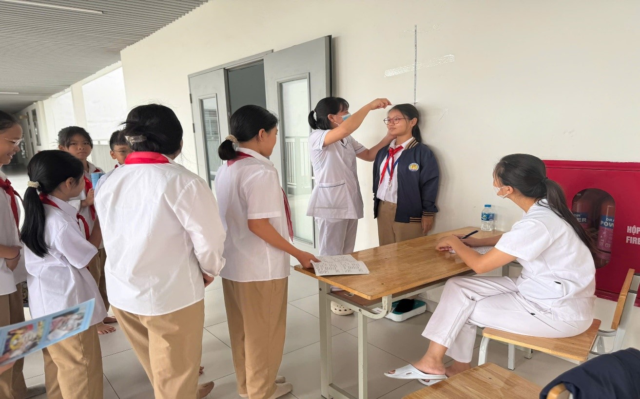 Nhân viên y tế cùng với cán bộ giáo viên nhà trường đã phối hợp nhịp nhàng, hướng dẫn học sinh xếp hàng trật tự, đảm bảo an toàn và vệ sinh trong suốt quá trình khám.