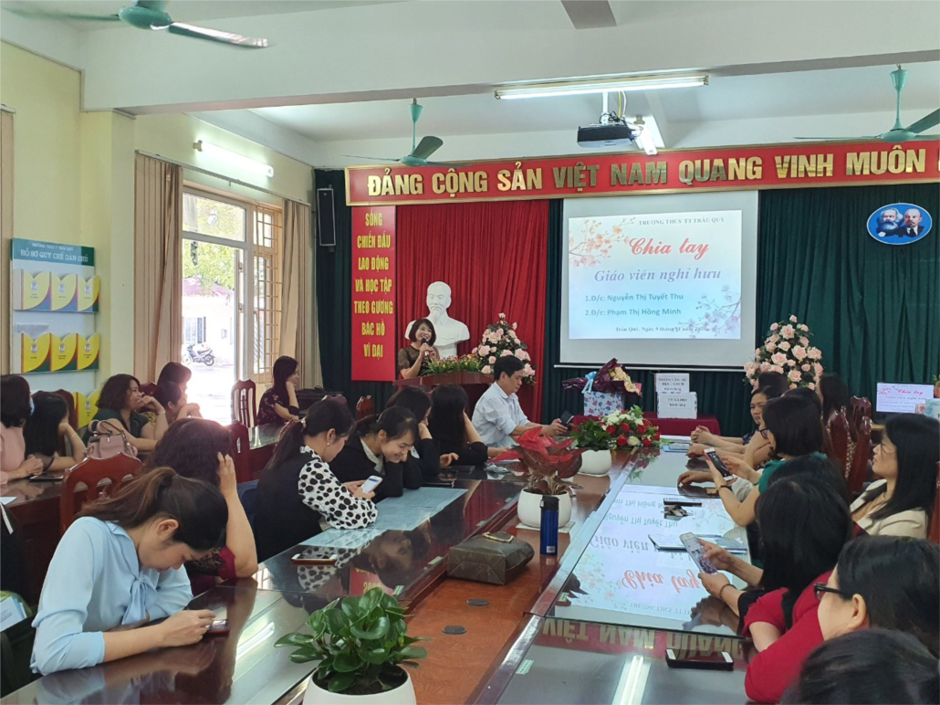 Trong không khí đầm ấm, thân mật của buổi chia tay đồng chí Đỗ Thị Hải Yến-Phó hiệu trưởng nhà trường đã ôn lại chặng đường dạy học của hai đồng chí Nguyễn Thị tuyết Thu và Phạm Thị Hồng Minh từ lúc mới tốt nghiệp trường sư phạm đến khi được nghỉ hưu theo chế độ. Đồng chí Yến nói: “Nhắc đến đ/c Nguyễn Thị Tuyết Thu là nhắc đến một cô giáo đầy lòng nhiệt huyết, yêu nghề, mến trẻ. Đồng chí đã đảm nhiệm nhiều vai trò như giáo viên bộ môn, giáo viên chủ nhiệm. Dù ở cương vị nào, vai trò nào đồng chí đều hoàn thành tốt nhiệm vụ được giao. Đồng chí đã nhiều lần là giáo viên dạy giỏi cấp huyện, có nhiều học sinh giỏi môn Sinh học và là tấm gương sáng cho học sinh noi theo, cho đồng nghiệp học tập. Nhắc đến đồng chí Phạm Thị Hồng Minh là nhắc đến “một cây công đoàn gạo cội”. Công đoàn và nhà trường luôn ghi nhận sự đóng góp của đồng chí trong các thành tích chung của nhà trường. Tập thể luôn cảm ơn đồng chí vì những hoạt động công đoàn đầy trân quý, gắn bó của mái ấm Trâu Quỳ nơi dấu ấn là các buổi tham quan dã ngoại, xả stress không thể nào quên mà đồng chí đã đóng góp rất nhiều công sức của mình. Với học sinh đồng chí luôn là người mẹ hiền với đàn con yêu dấu”.