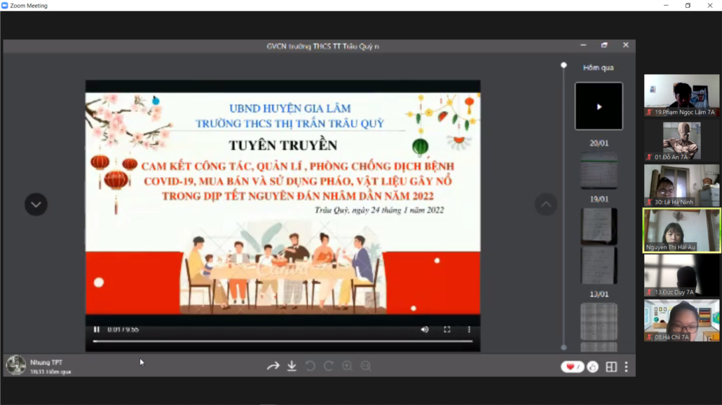 Thực hiện chỉ đạo trên, trong buổi sinh hoạt trực tuyến, học sinh trường THCS TT Trau Quỳ đã được tìm hiểu về tác hại của việc sử dụng pháo nổ, vật liệu gây nổ và những quy định về việc cấm sử dụng những vật dụng trên. Qua đó, các em được giáo dục ý thức chấp hành nghiêm túc quy định của pháp luật, đồng thời tuyên truyền cho những người xung quanh cùng thực hiện tốt để góp phần đảm bảo trật tự an toàn xã hội, vì bình yên và hạnh phúc của nhân dân, xây dựng đời sống văn hoá, đón mừng năm mới vui tươi, lành mạnh, văn minh và phát triển.