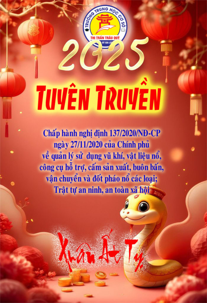 Hòa trong không khí toàn Đảng, toàn dân và đồng bào cả nước chuẩn bị đón xuân Ất Tỵ 2025, Cha mẹ học sinh và các bạn học sinh trường THCS Thị trấn Trâu Quỳ hãy thực hiện và tuyên truyền cho người thân trong gia đình mình thực hiện tốt các nội dung sau: